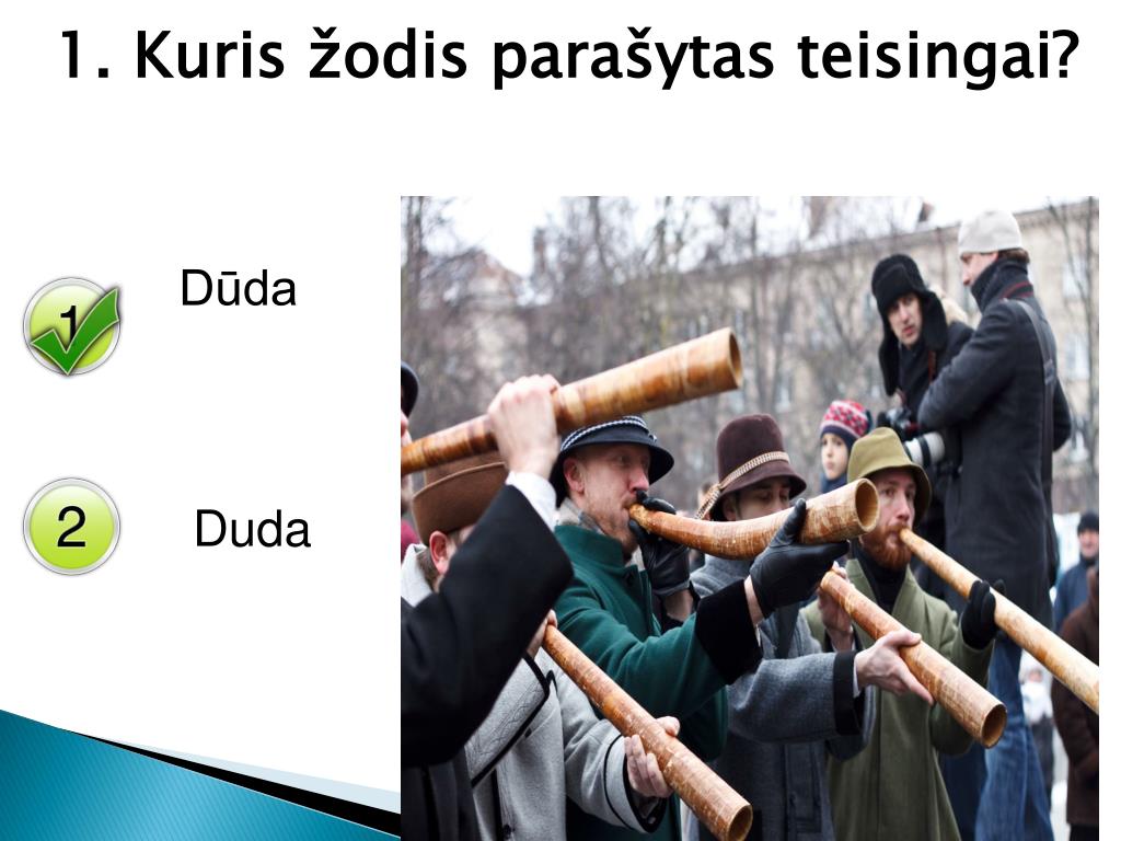 1. Kuris žodis parašytas teisingai? Dūda Duda