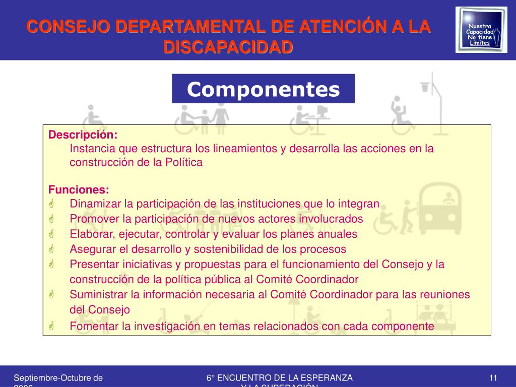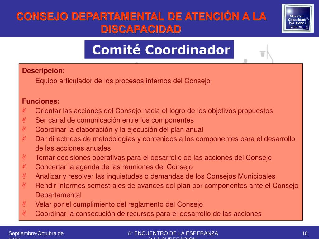 CONSEJO DEPARTAMENTAL DE ATENCIÓN A LA DISCAPACIDAD Comité Coordinador Descripción: Equipo articulador de los procesos internos del Consejo Funciones: • Orientar las acciones del Consejo hacia el logro de los objetivos propuestos • Ser canal de comunicación entre los componentes • Coordinar la elaboración y la ejecución del plan anual • Dar directrices de metodologías y contenidos a los componentes para el desarrollo de las acciones anuales • Tomar decisiones operativas para el desarrollo de las acciones del Consejo • Concertar la agenda de las reuniones del Consejo • Analizar y resolver las inquietudes o demandas de los Consejos Municipales • Rendir informes semestrales de avances del plan por componentes ante el Consejo Departamental • Velar por el cumplimiento del reglamento del Consejo • Coordinar la consecución de recursos para el desarrollo de las acciones 6° ENCUENTRO DE LA ESPERANZA Y LA SUPERACIÓN