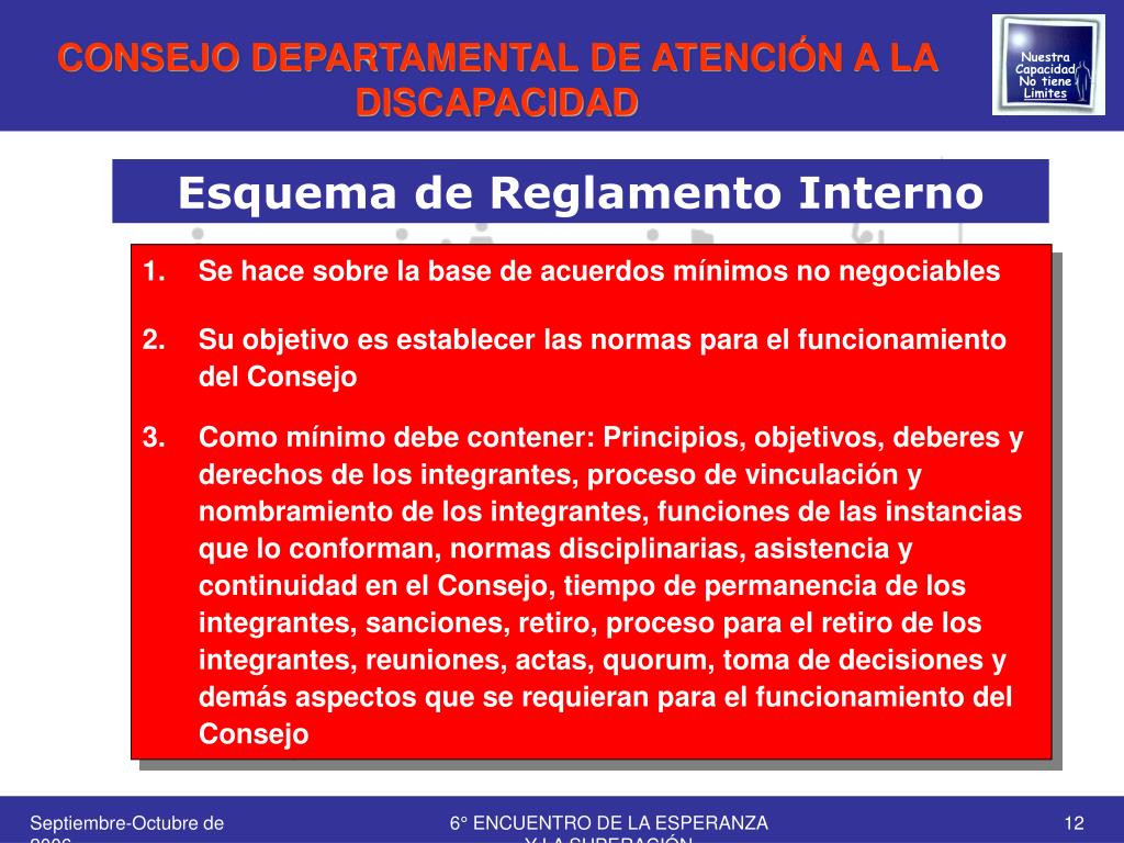 Esquema de Reglamento Interno • Se hace sobre la base de acuerdos mínimos no negociables • Su objetivo es establecer las normas para el funcionamiento del Consejo • Como mínimo debe contener: Principios, objetivos, deberes y derechos de los integrantes, proceso de vinculación y nombramiento de los integrantes, funciones de las instancias que lo conforman, normas disciplinarias, asistencia y continuidad en el Consejo, tiempo de permanencia de los integrantes, sanciones, retiro, proceso para el retiro de los integrantes, reuniones, actas, quorum, toma de decisiones y demás aspectos que se requieran para el funcionamiento del Consejo 6° ENCUENTRO DE LA ESPERANZA Y LA SUPERACIÓN