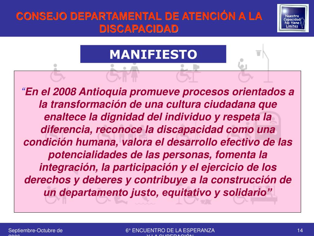 MANIFIESTO “En el 2008 Antioquia promueve procesos orientados a la transformación de una cultura ciudadana que enaltece la dignidad del individuo y respeta la diferencia, reconoce la discapacidad como una condición humana, valora el desarrollo efectivo de las potencialidades de las personas, fomenta la integración, la participación y el ejercicio de los derechos y deberes y contribuye a la construcción de un departamento justo, equitativo y solidario” 6° ENCUENTRO DE LA ESPERANZA Y LA SUPERACIÓN