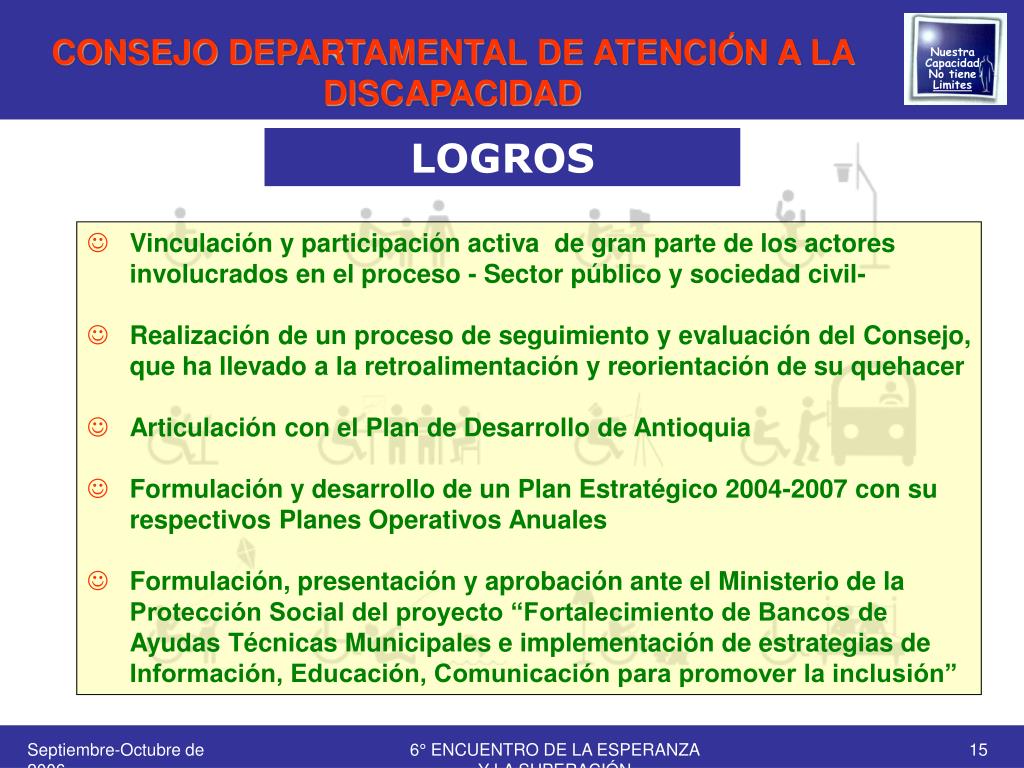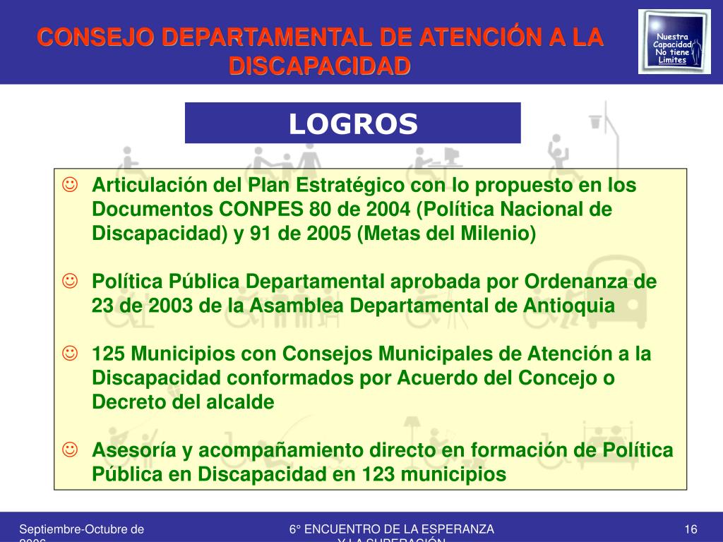 LOGROS • Articulación del Plan Estratégico con lo propuesto en los Documentos CONPES 80 de 2004 (Política Nacional de Discapacidad) y 91 de 2005 (Metas del Milenio) • Política Pública Departamental aprobada por Ordenanza de 23 de 2003 de la Asamblea Departamental de Antioquia • 125 Municipios con Consejos Municipales de Atención a la Discapacidad conformados por Acuerdo del Concejo o Decreto del alcalde • Asesoría y acompañamiento directo en formación de Política Pública en Discapacidad en 123 municipios 6° ENCUENTRO DE LA ESPERANZA Y LA SUPERACIÓN
