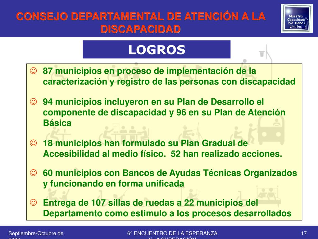 LOGROS • 87 municipios en proceso de implementación de la caracterización y registro de las personas con discapacidad • 94 municipios incluyeron en su Plan de Desarrollo el componente de discapacidad y 96 en su Plan de Atención Básica • 18 municipios han formulado su Plan Gradual de Accesibilidad al medio físico. 52 han realizado acciones. • 60 municipios con Bancos de Ayudas Técnicas Organizados y funcionando en forma unificada • Entrega de 107 sillas de ruedas a 22 municipios del Departamento como estimulo a los procesos desarrollados 6° ENCUENTRO DE LA ESPERANZA Y LA SUPERACIÓN