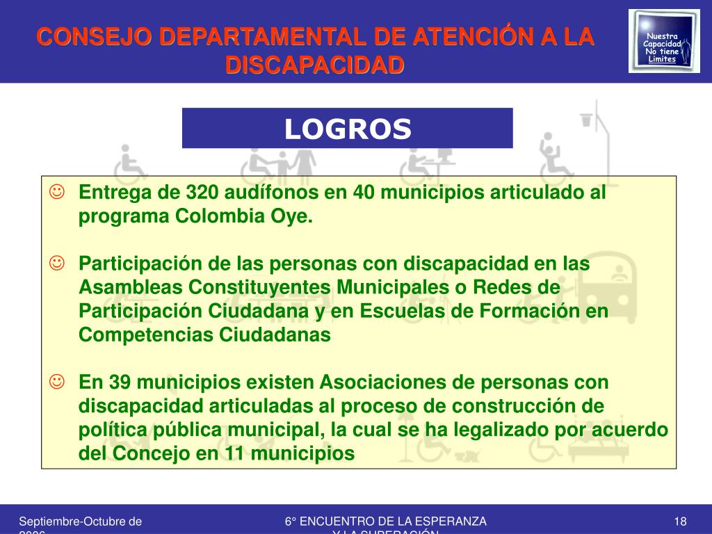 LOGROS • Entrega de 320 audífonos en 40 municipios articulado al programa Colombia Oye. • Participación de las personas con discapacidad en las Asambleas Constituyentes Municipales o Redes de Participación Ciudadana y en Escuelas de Formación en Competencias Ciudadanas • En 39 municipios existen Asociaciones de personas con discapacidad articuladas al proceso de construcción de política pública municipal, la cual se ha legalizado por acuerdo del Concejo en 11 municipios 6° ENCUENTRO DE LA ESPERANZA Y LA SUPERACIÓN