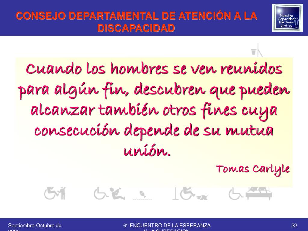 Cuando los hombres se ven reunidos para algún fin, descubren que pueden alcanzar también otros fines cuya consecución depende de su mutua unión. Tomas Carlyle 6° ENCUENTRO DE LA ESPERANZA Y LA SUPERACIÓN