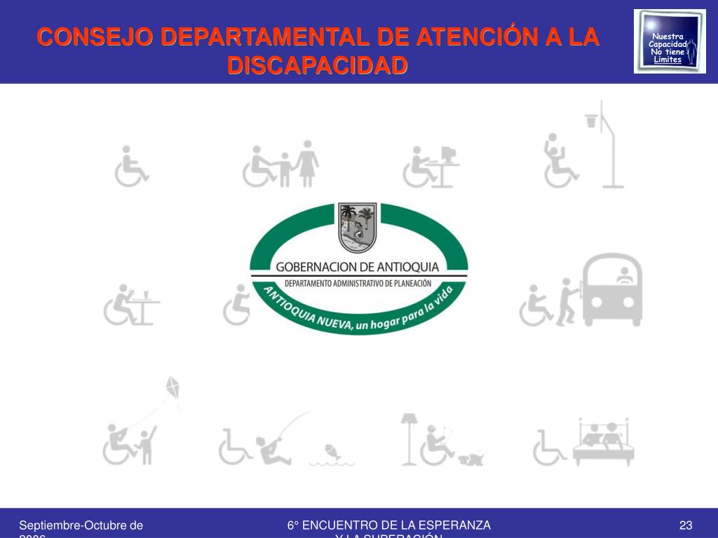 NORMATIVIDAD • LEY 361 DE 1997: Integración social de las personas con limitaciones • ORDENANZA 10 del 15 de junio de 2001 “Se adopta el Plan Nacional de Atención a la Discapacidad 1999-2002” • DECRETO 1084 DE 2001,Gobernación de Antioquia “Se crea el Consejo Departamental para la Política Social” • DECRETO 1672 de 2001,Gobernación de Antioquia, “Reglamenta la Ordenanza 10, Integrantes” • ORDENANZA 23 de 2003“Se fija la Política Pública en materia de Discapacidad” 6° ENCUENTRO DE LA ESPERANZA Y LA SUPERACIÓN