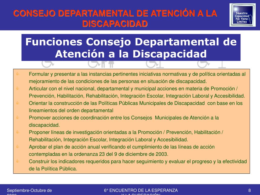 Funciones Consejo Departamental de Atención a la Discapacidad • Formular y presentar a las instancias pertinentes iniciativas normativas y de política orientadas al mejoramiento de las condiciones de las personas en situación de discapacidad. • Articular con el nivel nacional, departamental y municipal acciones en materia de Promoción / Prevención, Habilitación, Rehabilitación, Integración Escolar, Integración Laboral y Accesibilidad. • Orientar la construcción de las Políticas Públicas Municipales de Discapacidad con base en los lineamientos del orden departamental • Promover acciones de coordinación entre los Consejos Municipales de Atención a la discapacidad. • Proponer líneas de investigación orientadas a la Promoción / Prevención, Habilitación / Rehabilitación, Integración Escolar, Integración Laboral y Accesibilidad. • Aprobar el plan de acción anual verificando el cumplimiento de las líneas de acción contempladas en la ordenanza 23 del 9 de diciembre de 2003. • Construir los indicadores requeridos para hacer seguimiento y evaluar el progreso y la efectividad de la Política Pública. 6° ENCUENTRO DE LA ESPERANZA Y LA SUPERACIÓN