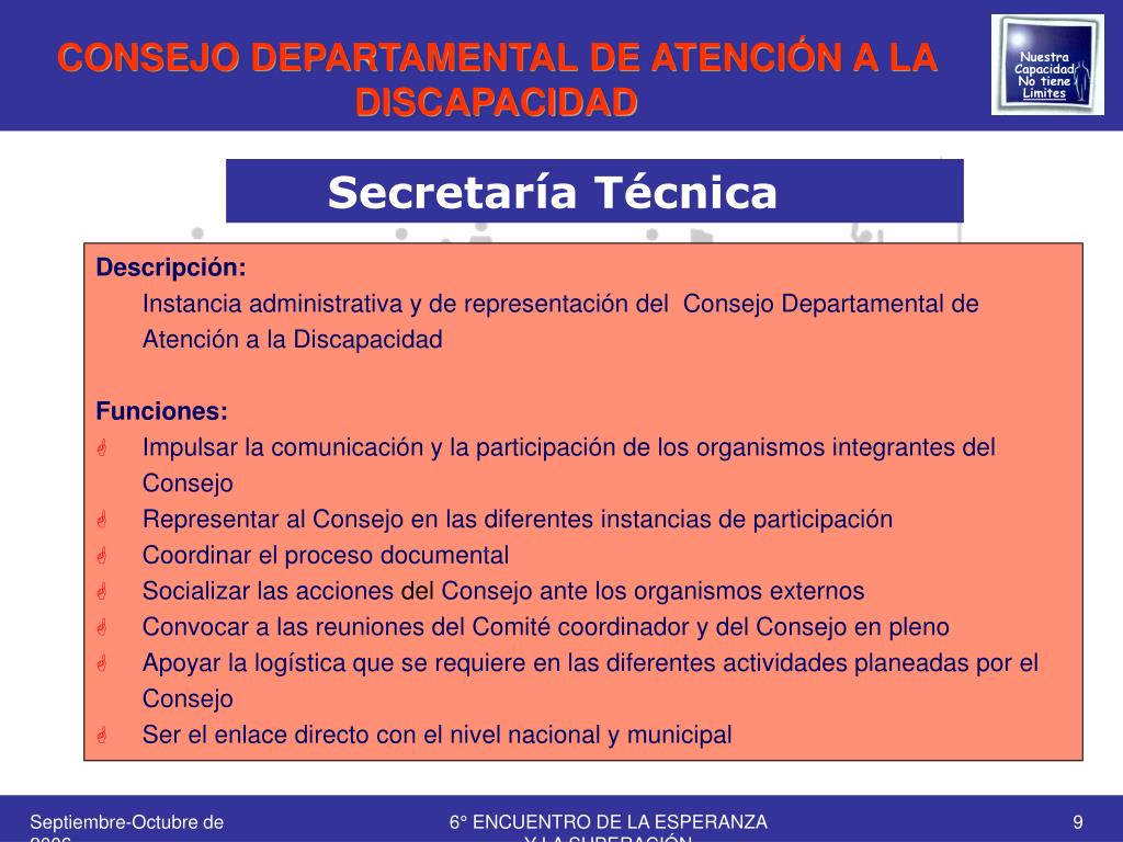 Secretaría Técnica Descripción: Instancia administrativa y de representación del Consejo Departamental de Atención a la Discapacidad Funciones: • Impulsar la comunicación y la participación de los organismos integrantes del Consejo • Representar al Consejo en las diferentes instancias de participación • Coordinar el proceso documental • Socializar las acciones del Consejo ante los organismos externos • Convocar a las reuniones del Comité coordinador y del Consejo en pleno • Apoyar la logística que se requiere en las diferentes actividades planeadas por el Consejo • Ser el enlace directo con el nivel nacional y municipal 6° ENCUENTRO DE LA ESPERANZA Y LA SUPERACIÓN