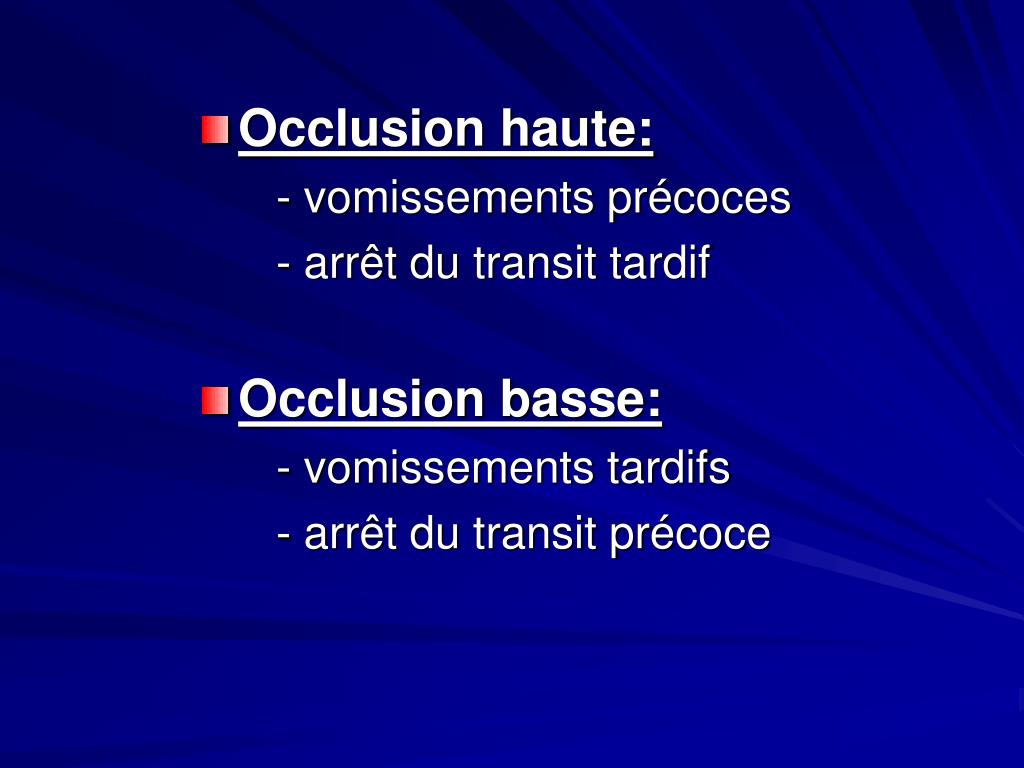 Occlusion haute: - vomissements précoces - arrêt du transit tardif • Occlusion basse: - vomissements tardifs - arrêt du transit précoce