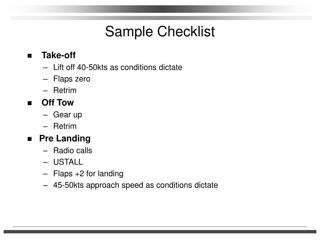 Sample Checklist • Take-off • Lift off 40-50kts as conditions dictate • Flaps zero • Retrim • Off Tow • Gear up • Retrim • Pre Landing • Radio calls • USTALL • Flaps +2 for landing • 45-50kts approach speed as conditions dictate