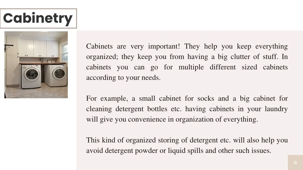 Cabinetry Cabinets are very important! They help you keep everything organized; they keep you from having a big clutter of stuff. In cabinets you can go for multiple different sized cabinets according to your needs. For example, a small cabinet for socks and a big cabinet for cleaning detergent bottles etc. having cabinets in your laundry will give you convenience in organization of everything. This kind of organized storing of detergent etc. will also help you avoid detergent powder or liquid spills and other such issues. 6