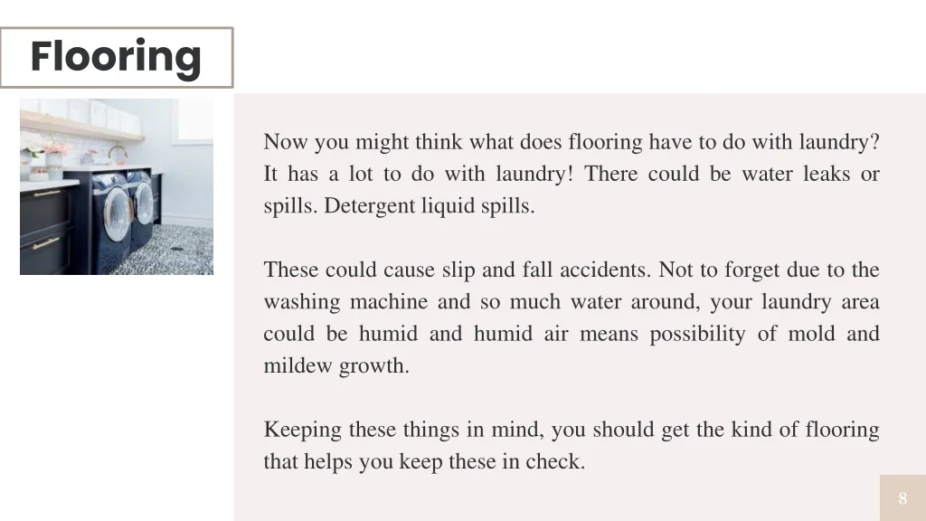 Flooring Now you might think what does flooring have to do with laundry? It has a lot to do with laundry! There could be water leaks or spills. Detergent liquid spills. These could cause slip and fall accidents. Not to forget due to the washing machine and so much water around, your laundry area could be humid and humid air means possibility of mold and mildew growth. Keeping these things in mind, you should get the kind of flooring that helps you keep these in check. 8