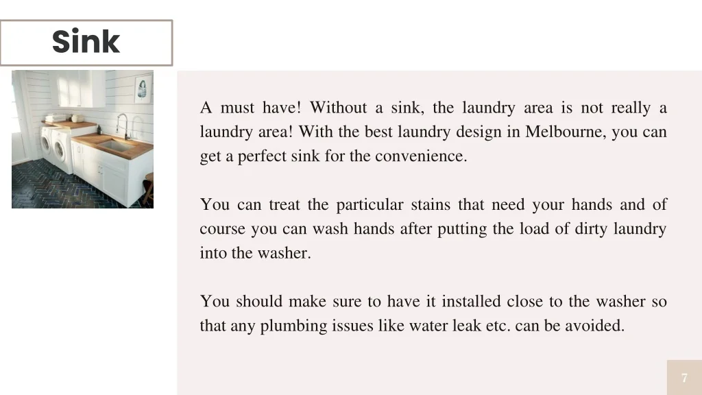 Sink A must have! Without a sink, the laundry area is not really a laundry area! With the best laundry design in Melbourne, you can get a perfect sink for the convenience. You can treat the particular stains that need your hands and of course you can wash hands after putting the load of dirty laundry into the washer. You should make sure to have it installed close to the washer so that any plumbing issues like water leak etc. can be avoided. 7