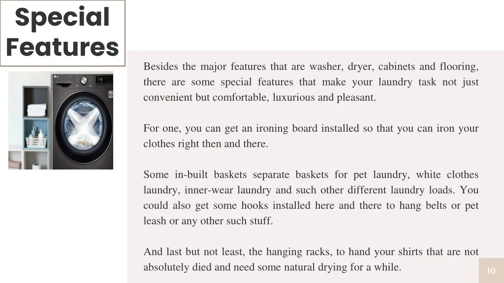 Special Features Besides the major features that are washer, dryer, cabinets and flooring, there are some special features that make your laundry task not just convenient but comfortable, luxurious and pleasant. For one, you can get an ironing board installed so that you can iron your clothes right then and there. Some in-built baskets separate baskets for pet laundry, white clothes laundry, inner-wear laundry and such other different laundry loads. You could also get some hooks installed here and there to hang belts or pet leash or any other such stuff. And last but not least, the hanging racks, to hand your shirts that are not absolutely died and need some natural drying for a while. 10