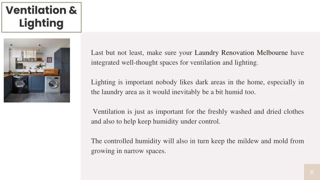 Ventilation & Lighting Last but not least, make sure your Laundry Renovation Melbourne have integrated well-thought spaces for ventilation and lighting. Lighting is important nobody likes dark areas in the home, especially in the laundry area as it would inevitably be a bit humid too. Ventilation is just as important for the freshly washed and dried clothes and also to help keep humidity under control. The controlled humidity will also in turn keep the mildew and mold from growing in narrow spaces. 11