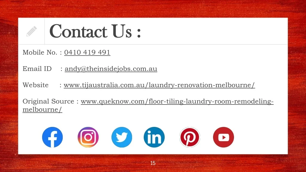 Contact Us : Mobile No. : 0410 419 491 Email ID : andy@theinsidejobs.com.au Website : www.tijaustralia.com.au/laundry-renovation-melbourne/ Original Source : www.queknow.com/floor-tiling-laundry-room-remodeling-melbourne/