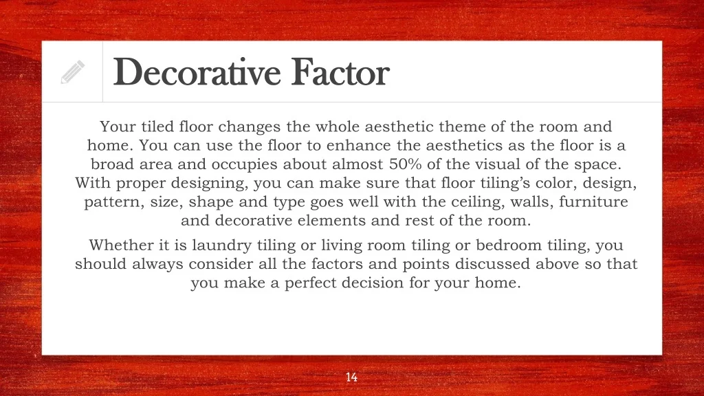Decorative Factor Your tiled floor changes the whole aesthetic theme of the room and home. You can use the floor to enhance the aesthetics as the floor is a broad area and occupies about almost 50% of the visual of the space. With proper designing, you can make sure that floor tiling’s color, design, pattern, size, shape and type goes well with the ceiling, walls, furniture and decorative elements and rest of the room. Whether it is laundry tiling or living room tiling or bedroom tiling, you should always consider all the factors and points discussed above so that you make a perfect decision for your home.