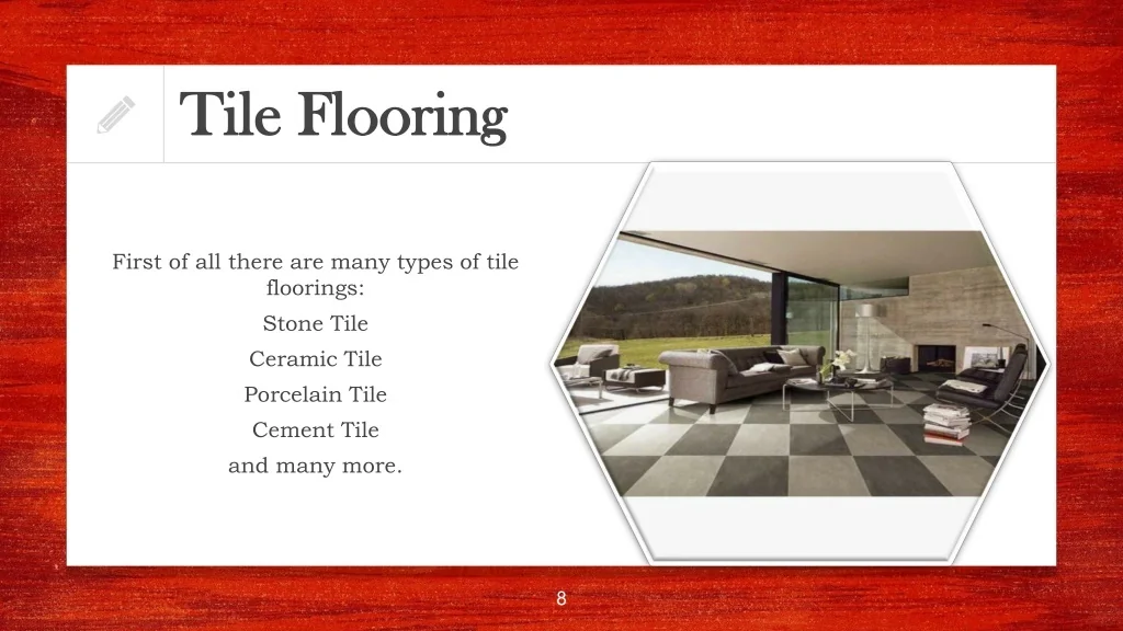 Tile Flooring First of all there are many types of tile floorings: Stone Tile Ceramic Tile Porcelain Tile Cement Tile and many more.
