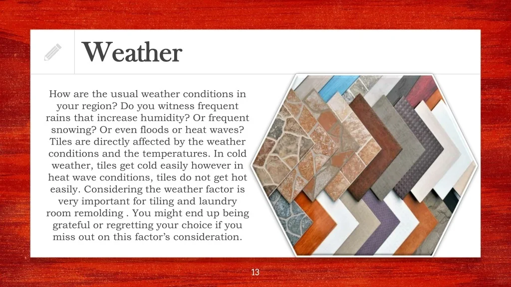 Weather How are the usual weather conditions in your region? Do you witness frequent rains that increase humidity? Or frequent snowing? Or even floods or heat waves? Tiles are directly affected by the weather conditions and the temperatures. In cold weather, tiles get cold easily however in heat wave conditions, tiles do not get hot easily. Considering the weather factor is very important for tiling and laundry room remolding . You might end up being grateful or regretting your choice if you miss out on this factor’s consideration.