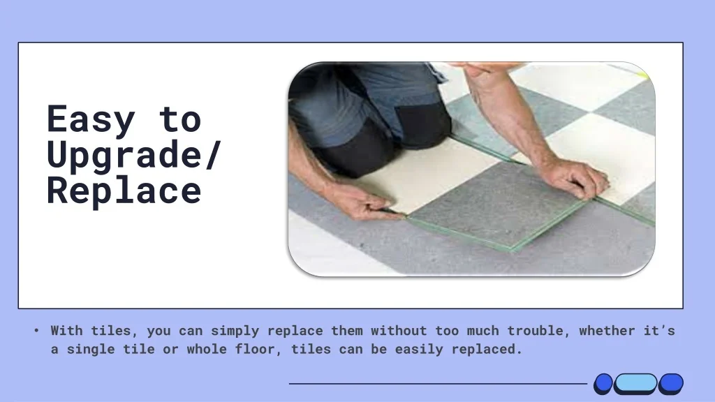 With tiles, you can simply replace them without too much trouble, whether it’s a single tile or whole floor, tiles can be easily replaced. Easy to Upgrade/Replace