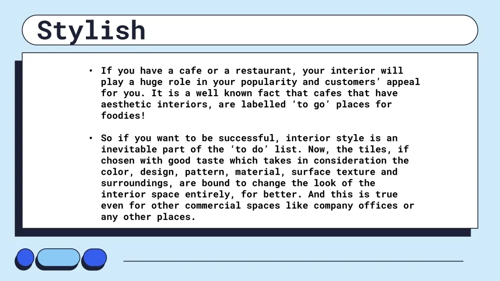 Stylish • If you have a cafe or a restaurant, your interior will play a huge role in your popularity and customers’ appeal for you. It is a well known fact that cafes that have aesthetic interiors, are labelled ‘to go’ places for foodies! • So if you want to be successful, interior style is an inevitable part of the ‘to do’ list. Now, the tiles, if chosen with good taste which takes in consideration the color, design, pattern, material, surface texture and surroundings, are bound to change the look of the interior space entirely, for better. And this is true even for other commercial spaces like company offices or any other places.