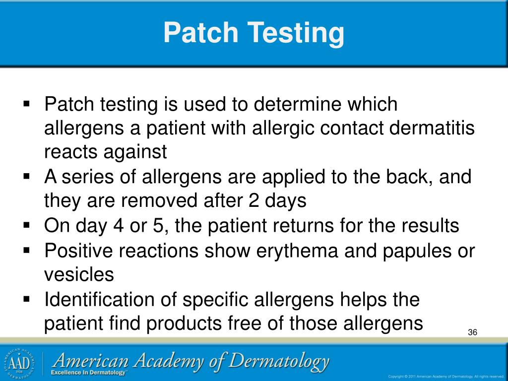 Identifying Allergens • Not all patients with ACD need patch testing • Refer patients when the allergen is unclear or the dermatitis is chronic • A positive reaction on patch testing does not mean that the patient’s rash is due to that specific allergen • Elimination of the rash with removal of the allergen confirms the clinical relevance of the positive patch test