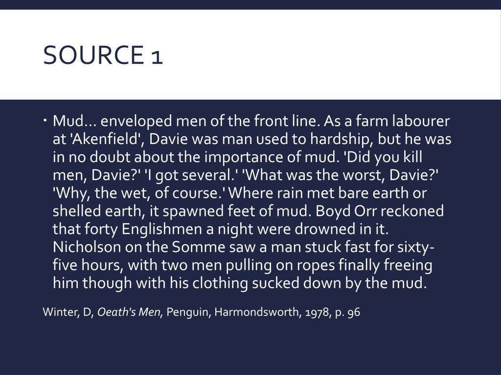 Source 1 • Mud... enveloped men of the front line. As a farm labourer at 'Akenfield', Davie was man used to hardship, but he was in no doubt about the importance of mud. 'Did you kill men, Davie?' 'I got several.' 'What was the worst, Davie?' 'Why, the wet, of course.' Where rain met bare earth or shelled earth, it spawned feet of mud. Boyd Orr reckoned that forty Englishmen a night were drowned in it. Nicholson on the Somme saw a man stuck fast for sixty-five hours, with two men pulling on ropes finally freeing him though with his clothing sucked down by the mud. Winter, D, Oeath's Men, Penguin, Harmondsworth, 1978, p. 96