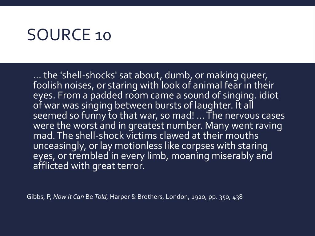 Source 10 ... the 'shell-shocks' sat about, dumb, or making queer, foolish noises, or staring with look of animal fear in their eyes. From a padded room came a sound of singing. idiot of war was singing between bursts of laughter. It all seemed so funny to that war, so mad! ... The nervous cases were the worst and in greatest number. Many went raving mad. The shell-shock victims clawed at their mouths unceasingly, or lay motionless like corpses with staring eyes, or trembled in every limb, moaning miserably and afflicted with great terror. Gibbs, P, Now It Can Be Told, Harper & Brothers, London, 1920, pp. 350, 438