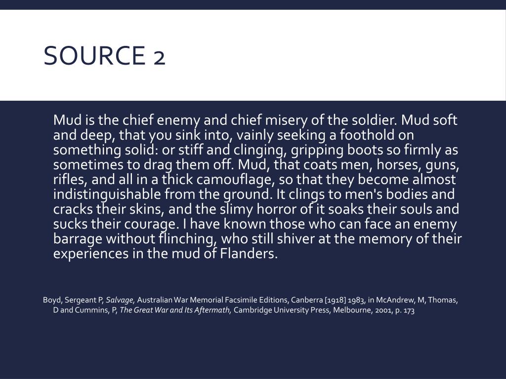 Source 2 Mud is the chief enemy and chief misery of the soldier. Mud soft and deep, that you sink into, vainly seeking a foothold on something solid: or stiff and clinging, gripping boots so firmly as sometimes to drag them off. Mud, that coats men, horses, guns, rifles, and all in a thick camouflage, so that they become almost indistinguishable from the ground. It clings to men's bodies and cracks their skins, and the slimy horror of it soaks their souls and sucks their courage. I have known those who can face an enemy barrage without flinching, who still shiver at the memory of their experiences in the mud of Flanders. Boyd, Sergeant P, Salvage, Australian War Memorial Facsimile Editions, Canberra [1918] 1983, in McAndrew, M, Thomas, D and Cummins, P, The Great War and Its Aftermath, Cambridge University Press, Melbourne, 2001, p. 173