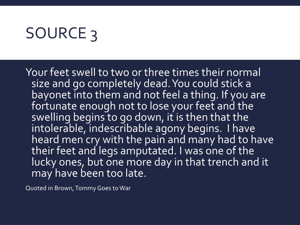 Source 3 Your feet swell to two or three times their normal size and go completely dead. You could stick a bayonet into them and not feel a thing. If you are fortunate enough not to lose your feet and the swelling begins to go down, it is then that the intolerable, indescribable agony begins. I have heard men cry with the pain and many had to have their feet and legs amputated. I was one of the lucky ones, but one more day in that trench and it may have been too late. Quoted in Brown, Tommy Goes to War