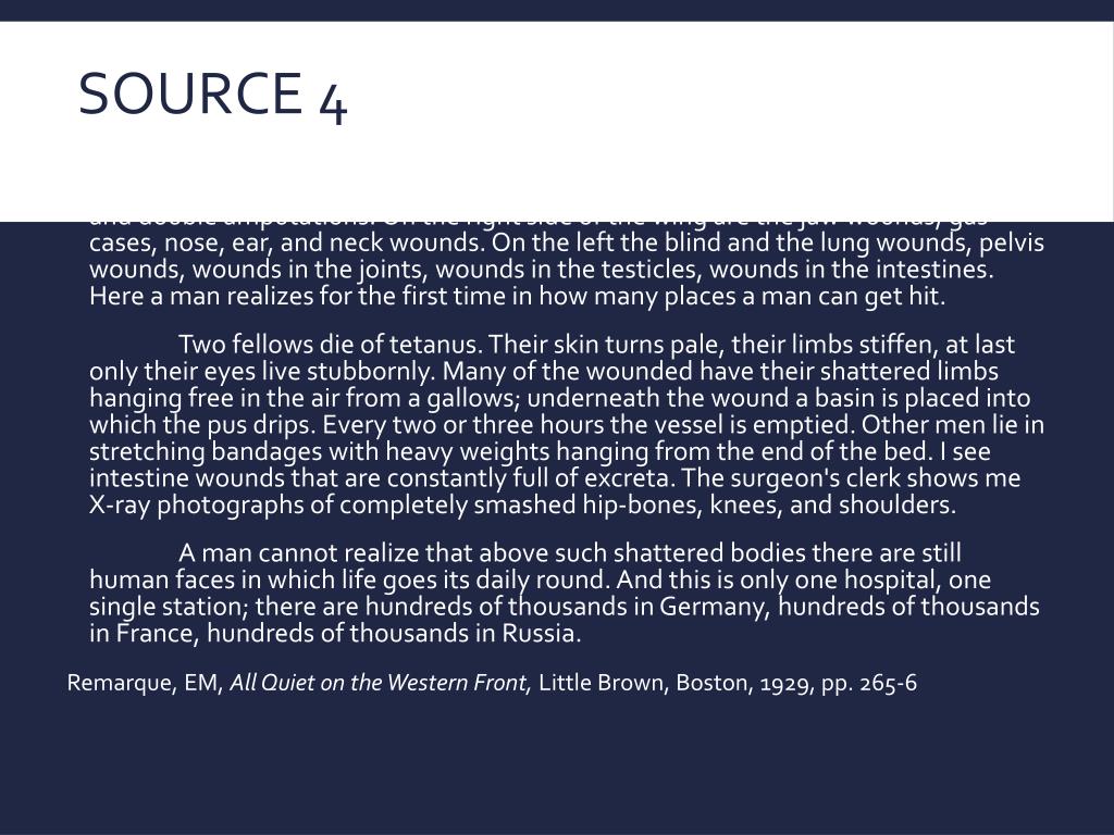 Source 4 On the next floor below are the abdominal and spine cases, head wounds and double amputations. On the right side of the wing are the jaw wounds, gas cases, nose, ear, and neck wounds. On the left the blind and the lung wounds, pelvis wounds, wounds in the joints, wounds in the testicles, wounds in the intestines. Here a man realizes for the first time in how many places a man can get hit. Two fellows die of tetanus. Their skin turns pale, their limbs stiffen, at last only their eyes live stubbornly. Many of the wounded have their shattered limbs hanging free in the air from a gallows; underneath the wound a basin is placed into which the pus drips. Every two or three hours the vessel is emptied. Other men lie in stretching bandages with heavy weights hanging from the end of the bed. I see intestine wounds that are constantly full of excreta. The surgeon's clerk shows me X-ray photographs of completely smashed hip-bones, knees, and shoulders. A man cannot realize that above such shattered bodies there are still human faces in which life goes its daily round. And this is only one hospital, one single station; there are hundreds of thousands in Germany, hundreds of thousands in France, hundreds of thousands in Russia. Remarque, EM, All Quiet on the Western Front, Little Brown, Boston, 1929, pp. 265-6
