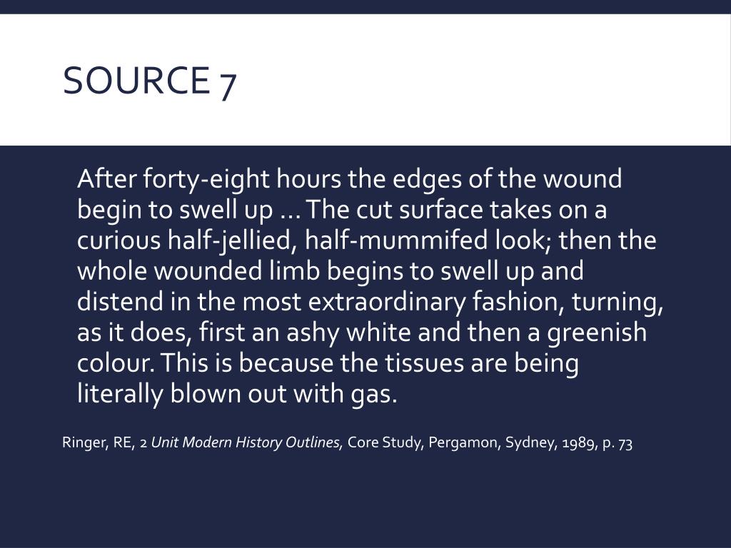 Source 7 After forty-eight hours the edges of the wound begin to swell up ... The cut surface takes on a curious half-jellied, half-mummifed look; then the whole wounded limb begins to swell up and distend in the most extraordinary fashion, turning, as it does, first an ashy white and then a greenish colour. This is because the tissues are being literally blown out with gas. Ringer, RE, 2 Unit Modern History Outlines, Core Study, Pergamon, Sydney, 1989, p. 73