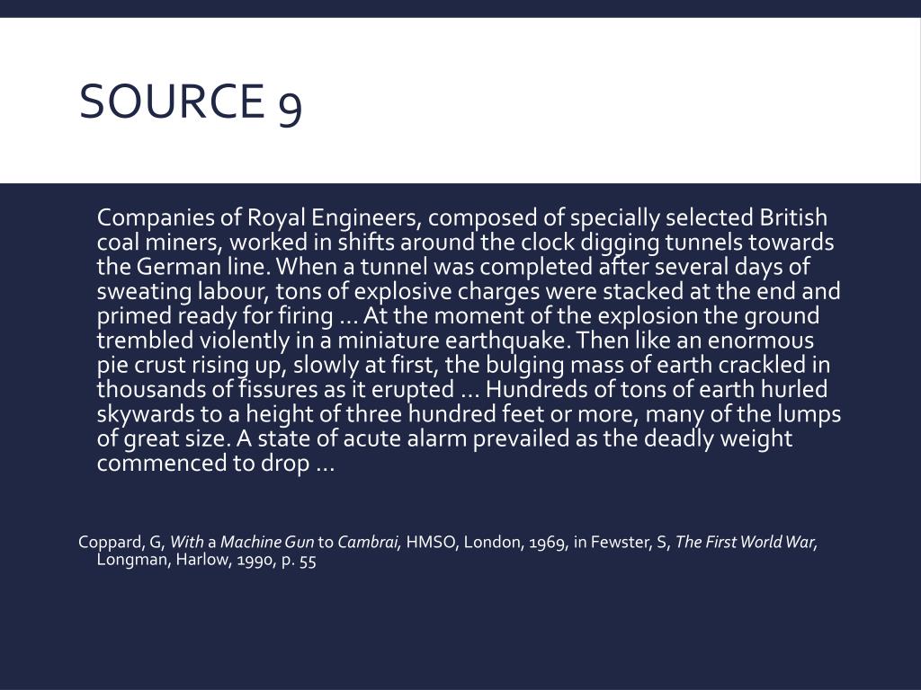 Source 9 Companies of Royal Engineers, composed of specially selected British coal miners, worked in shifts around the clock digging tunnels towards the German line. When a tunnel was completed after several days of sweating labour, tons of explosive charges were stacked at the end and primed ready for firing ... At the moment of the explosion the ground trembled violently in a miniature earthquake. Then like an enormous pie crust rising up, slowly at first, the bulging mass of earth crackled in thousands of fissures as it erupted ... Hundreds of tons of earth hurled skywards to a height of three hundred feet or more, many of the lumps of great size. A state of acute alarm prevailed as the deadly weight commenced to drop ... Coppard, G, With a Machine Gun to Cambrai, HMSO, London, 1969, in Fewster, S, The First World War, Longman, Harlow, 1990, p. 55