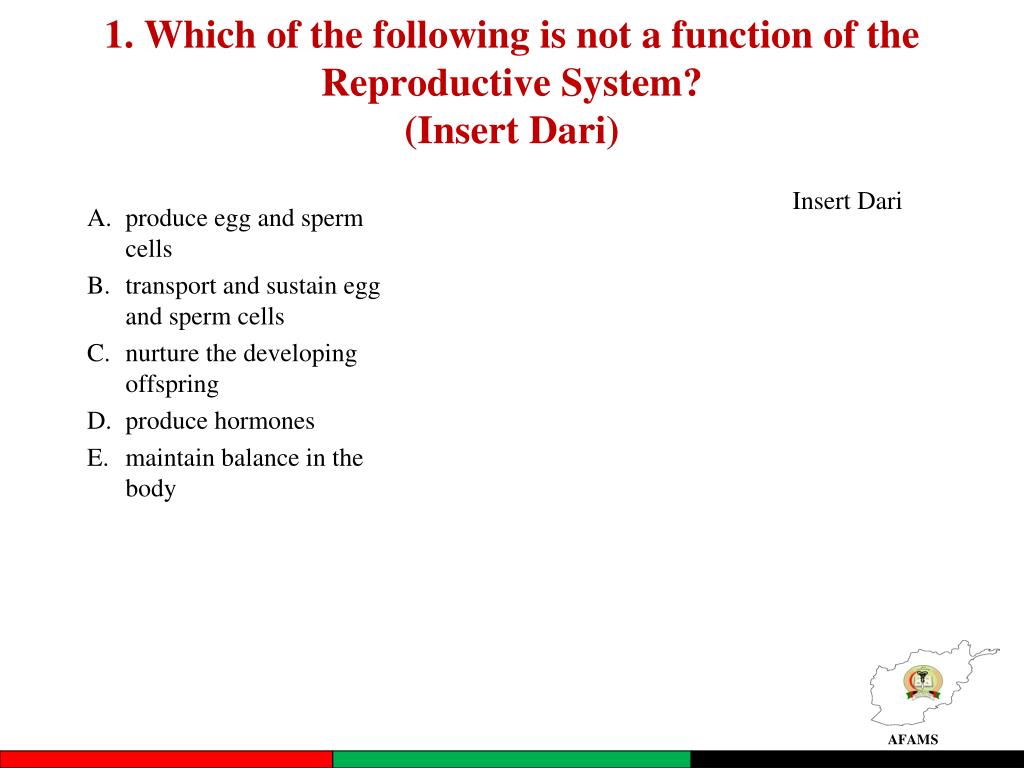 1. Which of the following is not a function of the Reproductive System? (Insert Dari) • produce egg and sperm cells • transport and sustain egg and sperm cells • nurture the developing offspring • produce hormones • maintain balance in the body Insert Dari