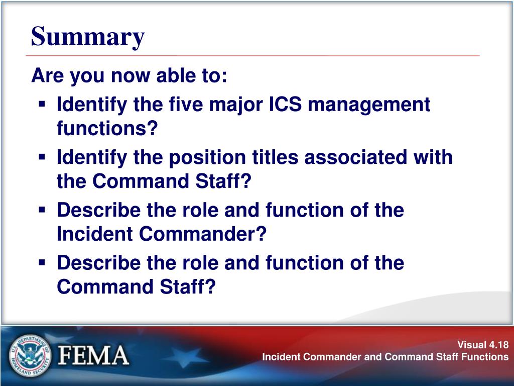 Summary • Are you now able to: • Identify the five major ICS management functions? • Identify the position titles associated with the Command Staff? • Describe the role and function of the Incident Commander? • Describe the role and function of the Command Staff?