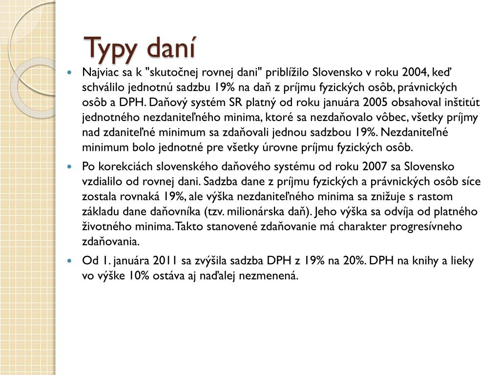 Typy daní • Najviac sa k "skutočnej rovnej dani" priblížilo Slovensko v roku 2004, keď schválilo jednotnú sadzbu 19% na daň z príjmu fyzických osôb, právnických osôb a DPH. Daňový systém SR platný od roku januára 2005 obsahoval inštitút jednotného nezdaniteľného minima, ktoré sa nezdaňovalo vôbec, všetky príjmy nad zdaniteľné minimum sa zdaňovali jednou sadzbou 19%. Nezdaniteľné minimum bolo jednotné pre všetky úrovne príjmu fyzických osôb. • Po korekciách slovenského daňového systému od roku 2007 sa Slovensko vzdialilo od rovnej dani. Sadzba dane z príjmu fyzických a právnických osôb síce zostala rovnaká 19%, ale výška nezdaniteľného minima sa znižuje s rastom základu dane daňovníka (tzv. milionárska daň). Jeho výška sa odvíja od platného životného minima. Takto stanovené zdaňovanie má charakter progresívneho zdaňovania. • Od 1. januára 2011 sa zvýšila sadzba DPH z 19% na 20%. DPH na knihy a lieky vo výške 10% ostáva aj naďalej nezmenená.