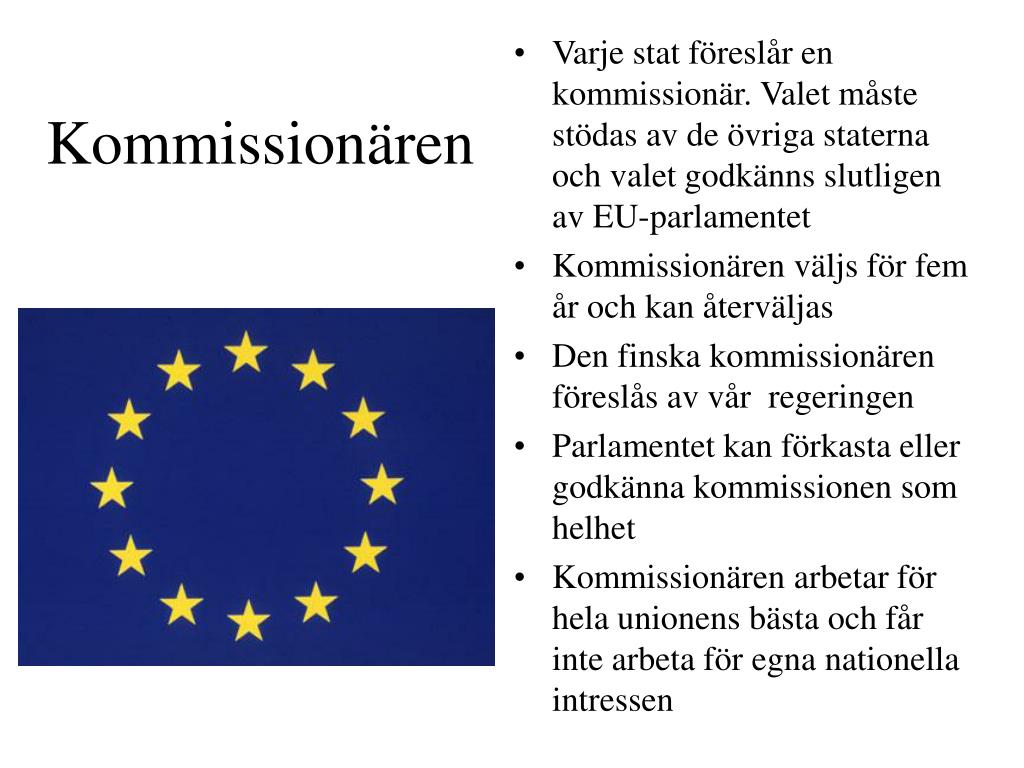 Kommissionären • Varje stat föreslår en kommissionär. Valet måste stödas av de övriga staterna och valet godkänns slutligen av EU-parlamentet • Kommissionären väljs för fem år och kan återväljas • Den finska kommissionären föreslås av vår regeringen • Parlamentet kan förkasta eller godkänna kommissionen som helhet • Kommissionären arbetar för hela unionens bästa och får inte arbeta för egna nationella intressen