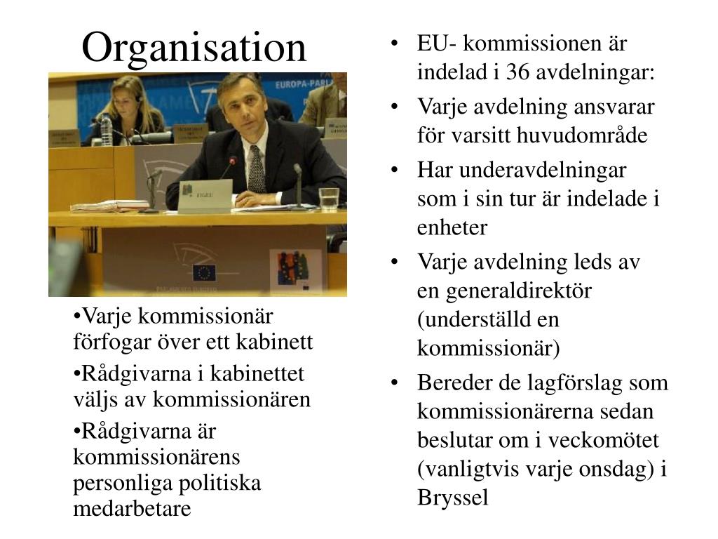 Organisation • EU- kommissionen är indelad i 36 avdelningar: • Varje avdelning ansvarar för varsitt huvudområde • Har underavdelningar som i sin tur är indelade i enheter • Varje avdelning leds av en generaldirektör (underställd en kommissionär) • Bereder de lagförslag som kommissionärerna sedan beslutar om i veckomötet (vanligtvis varje onsdag) i Bryssel • Varje kommissionär förfogar över ett kabinett • Rådgivarna i kabinettet väljs av kommissionären • Rådgivarna är kommissionärens personliga politiska medarbetare