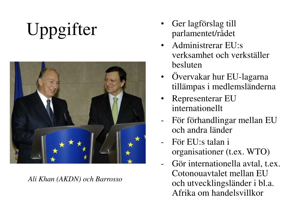 Uppgifter • Ger lagförslag till parlamentet/rådet • Administrerar EU:s verksamhet och verkställer besluten • Övervakar hur EU-lagarna tillämpas i medlemsländerna • Representerar EU internationellt • För förhandlingar mellan EU och andra länder • För EU:s talan i organisationer (t.ex. WTO) • Gör internationella avtal, t.ex. Cotonouavtalet mellan EU och utvecklingsländer i bl.a. Afrika om handelsvillkor Ali Khan (AKDN) och Barrosso