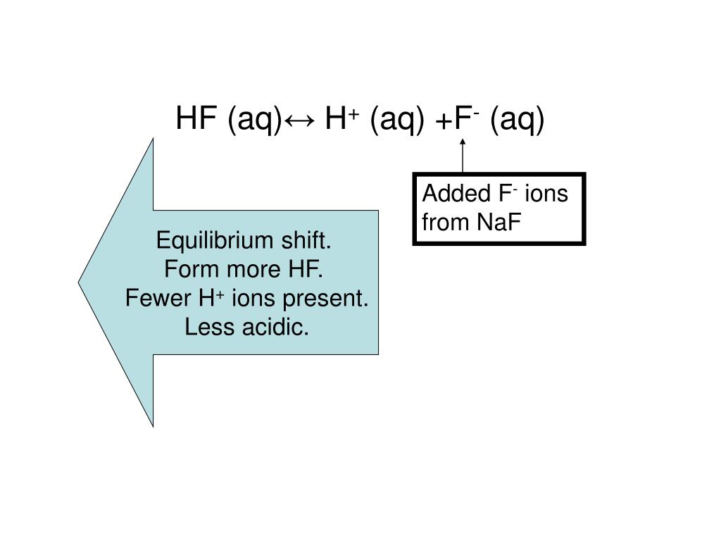 HF (aq)↔ H+ (aq) +F- (aq) Equilibrium shift. Form more HF. Fewer H+ ions present. Less acidic. Added F- ions from NaF