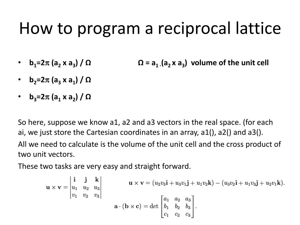 How to program a reciprocal lattice • b1=2 (a2x a3) / Ω Ω = a1 ·(a2 х a3) volume of the unit cell • b2=2 (a3x a1) / Ω • b3=2 (a1x a2) / Ω So here, suppose we know a1, a2 and a3 vectors in the real space. (for each ai, we just store the Cartesian coordinates in an array, a1(), a2() and a3(). All we need to calculate is the volume of the unit cell and the cross product of two unit vectors. These two tasks are very easy and straight forward.
