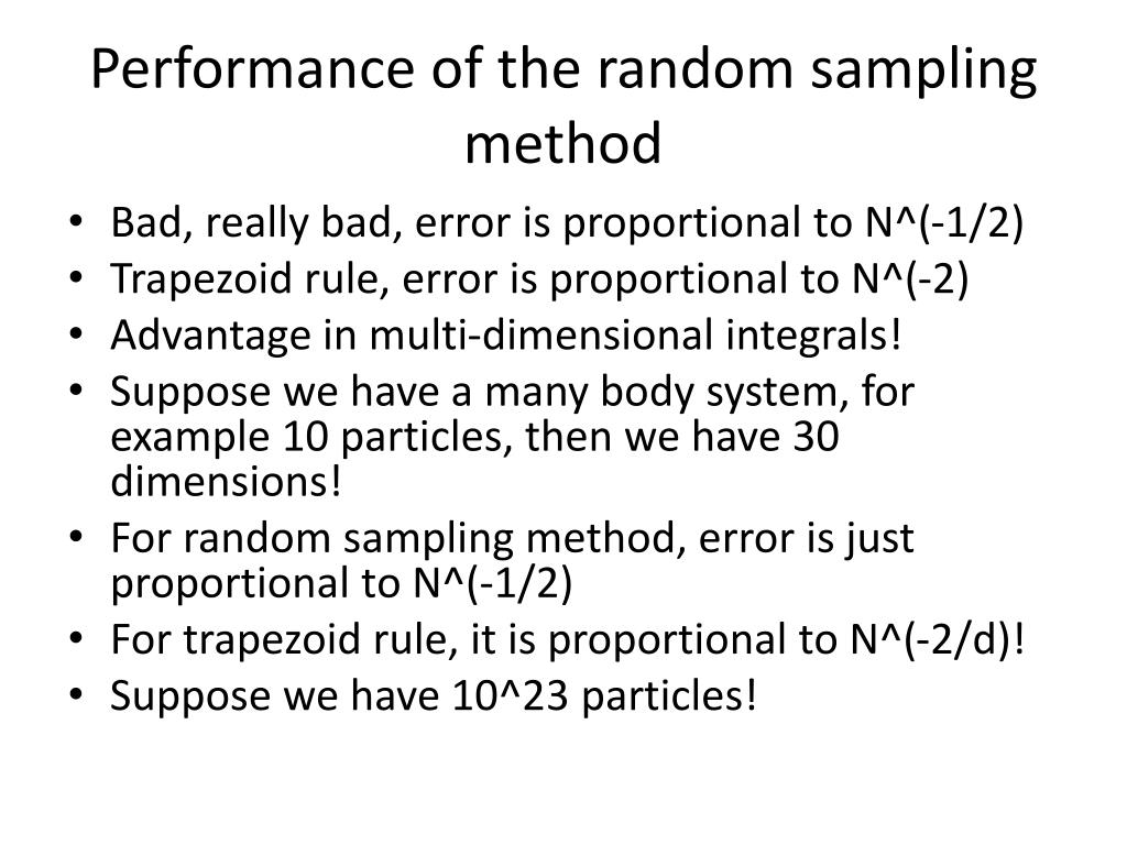 Performance of the random sampling method • Bad, really bad, error is proportional to N^(-1/2) • Trapezoid rule, error is proportional to N^(-2) • Advantage in multi-dimensional integrals! • Suppose we have a many body system, for example 10 particles, then we have 30 dimensions! • For random sampling method, error is just proportional to N^(-1/2) • For trapezoid rule, it is proportional to N^(-2/d)! • Suppose we have 10^23 particles!