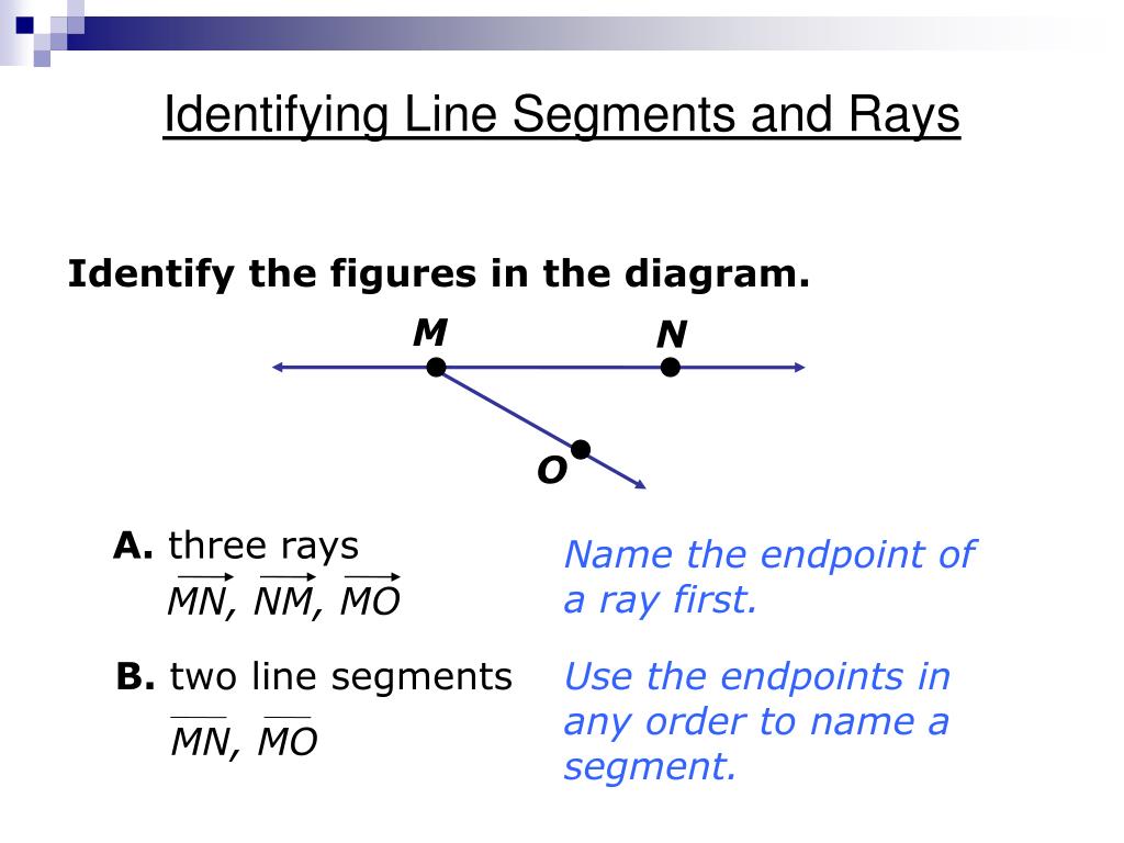 Identifying Line Segments and Rays Identify the figures in the diagram. M N O A. three rays Name the endpoint of a ray first. MN, NM, MO B. two line segments Use the endpoints in any order to name a segment. MN, MO