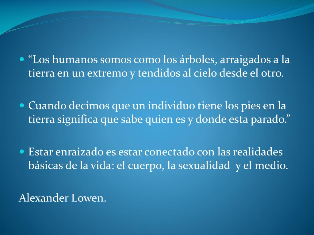 “Los humanos somos como los árboles, arraigados a la tierra en un extremo y tendidos al cielo desde el otro. • Cuando decimos que un individuo tiene los pies en la tierra significa que sabe quien es y donde esta parado.” • Estar enraizado es estar conectado con las realidades básicas de la vida: el cuerpo, la sexualidad y el medio. Alexander Lowen.