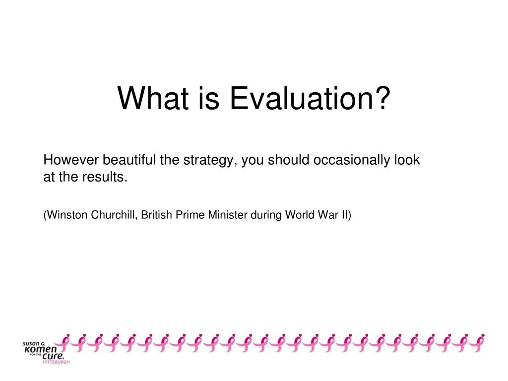 What is Evaluation? However beautiful the strategy, you should occasionally look at the results. (Winston Churchill, British Prime Minister during World War II)