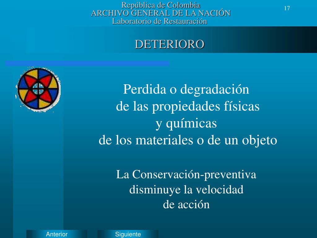 República de ColombiaARCHIVO GENERAL DE LA NACIÓNLaboratorio de Restauración DETERIORO Perdida o degradación de las propiedades físicas y químicas de los materiales o de un objeto La Conservación-preventiva disminuye la velocidad de acción