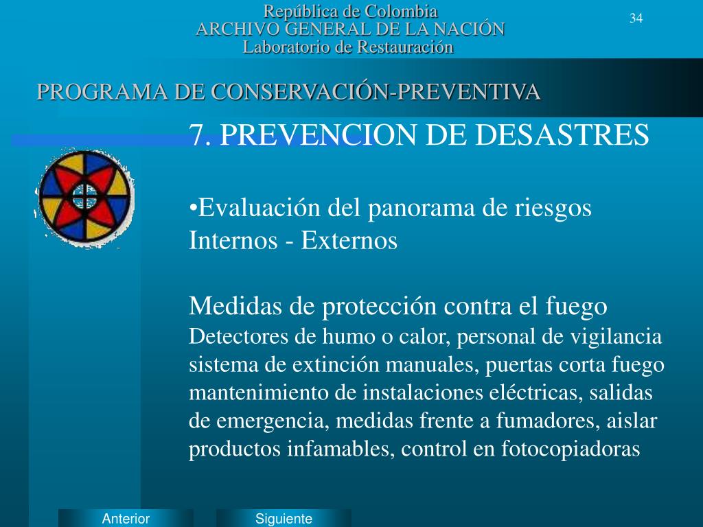 República de ColombiaARCHIVO GENERAL DE LA NACIÓNLaboratorio de Restauración PROGRAMA DE CONSERVACIÓN-PREVENTIVA • 7. PREVENCION DE DESASTRES • Evaluación del panorama de riesgos • Internos - Externos • Medidas de protección contra el fuego • Detectores de humo o calor, personal de vigilancia • sistema de extinción manuales, puertas corta fuego • mantenimiento de instalaciones eléctricas, salidas • de emergencia, medidas frente a fumadores, aislar • productos infamables, control en fotocopiadoras