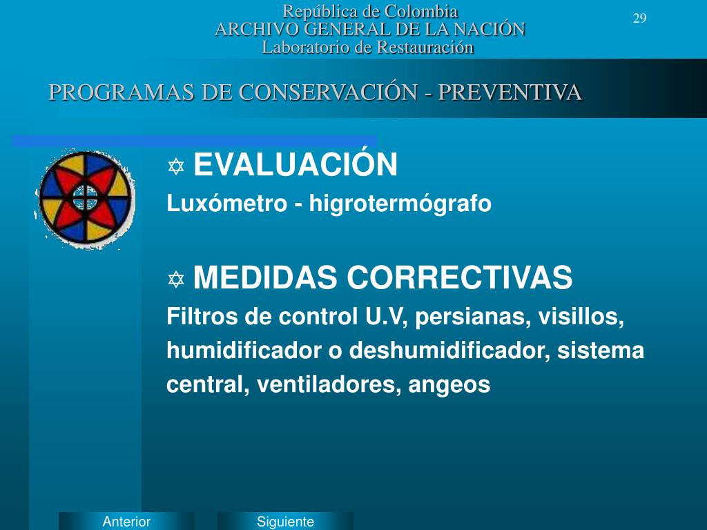 República de ColombiaARCHIVO GENERAL DE LA NACIÓNLaboratorio de Restauración PROGRAMAS DE CONSERVACIÓN - PREVENTIVA • EVALUACIÓN Luxómetro - higrotermógrafo • MEDIDAS CORRECTIVAS Filtros de control U.V, persianas, visillos, humidificador o deshumidificador, sistema central, ventiladores, angeos