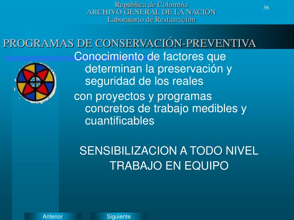 República de ColombiaARCHIVO GENERAL DE LA NACIÓNLaboratorio de Restauración PROGRAMAS DE CONSERVACIÓN-PREVENTIVA Conocimiento de factores que determinan la preservación y seguridad de los reales con proyectos y programas concretos de trabajo medibles y cuantificables SENSIBILIZACION A TODO NIVEL TRABAJO EN EQUIPO