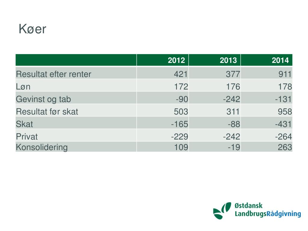 Om tallene fra Østdansk • De samme regnskaber indgår i alle 3 år • Vi har delt regnskaberne op i 5 ”driftsgrene” • Planteavl, slagtesvin, søer og kvæg og - som noget nyt-deltidslandmænd med fuldtidsarbejde • Der er meget store forskelle mellem ”de bedste” og ”de dårligste” indenfor hver driftsgren • Disse regnskaber er bedre end gennemsnittet.
