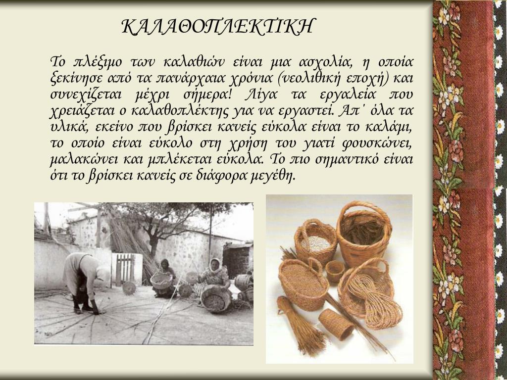 ΚΑΛΑΘΟΠΛΕΚΤΙΚΗ Το πλέξιμο των καλαθιών είναι μια ασχολία, η οποία ξεκίνησε από τα πανάρχαια χρόνια (νεολιθική εποχή) και συνεχίζεται μέχρι σήμερα! Λίγα τα εργαλεία που χρειάζεται ο καλαθοπλέκτης για να εργαστεί. Απ΄ όλα τα υλικά, εκείνο που βρίσκει κανείς εύκολα είναι το καλάμι, το οποίο είναι εύκολο στη χρήση του γιατί φουσκώνει, μαλακώνει και μπλέκεται εύκολα. Το πιο σημαντικό είναι ότι το βρίσκει κανείς σε διάφορα μεγέθη.